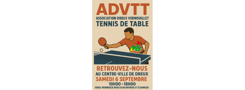 L’Association Dreux Vernouillet Tennis de Table (ADVTT) vous attend samedi 6 septembre, de 10h à 18h, en plein centre-ville de Dreux lors du Forum des Associations.